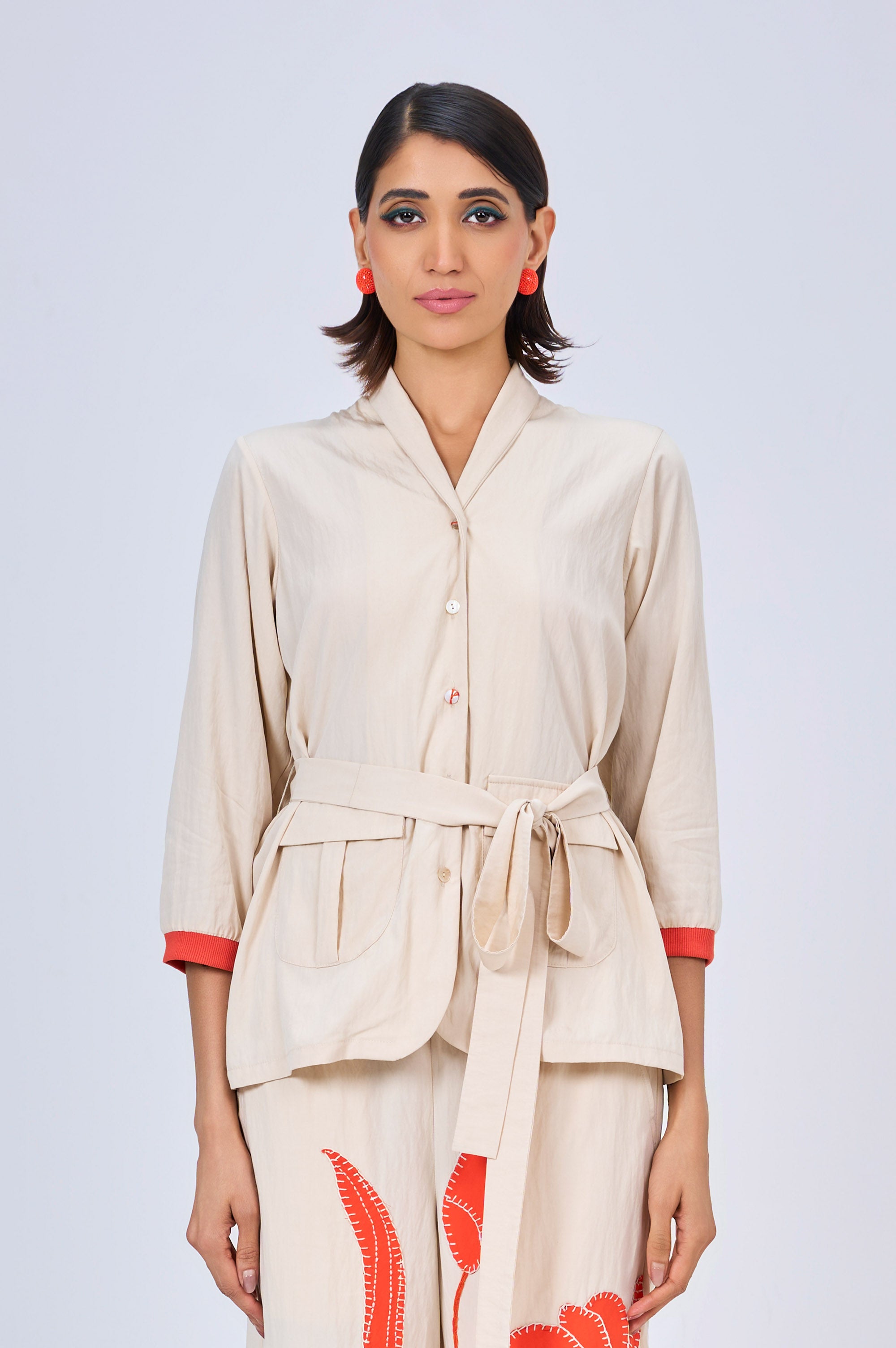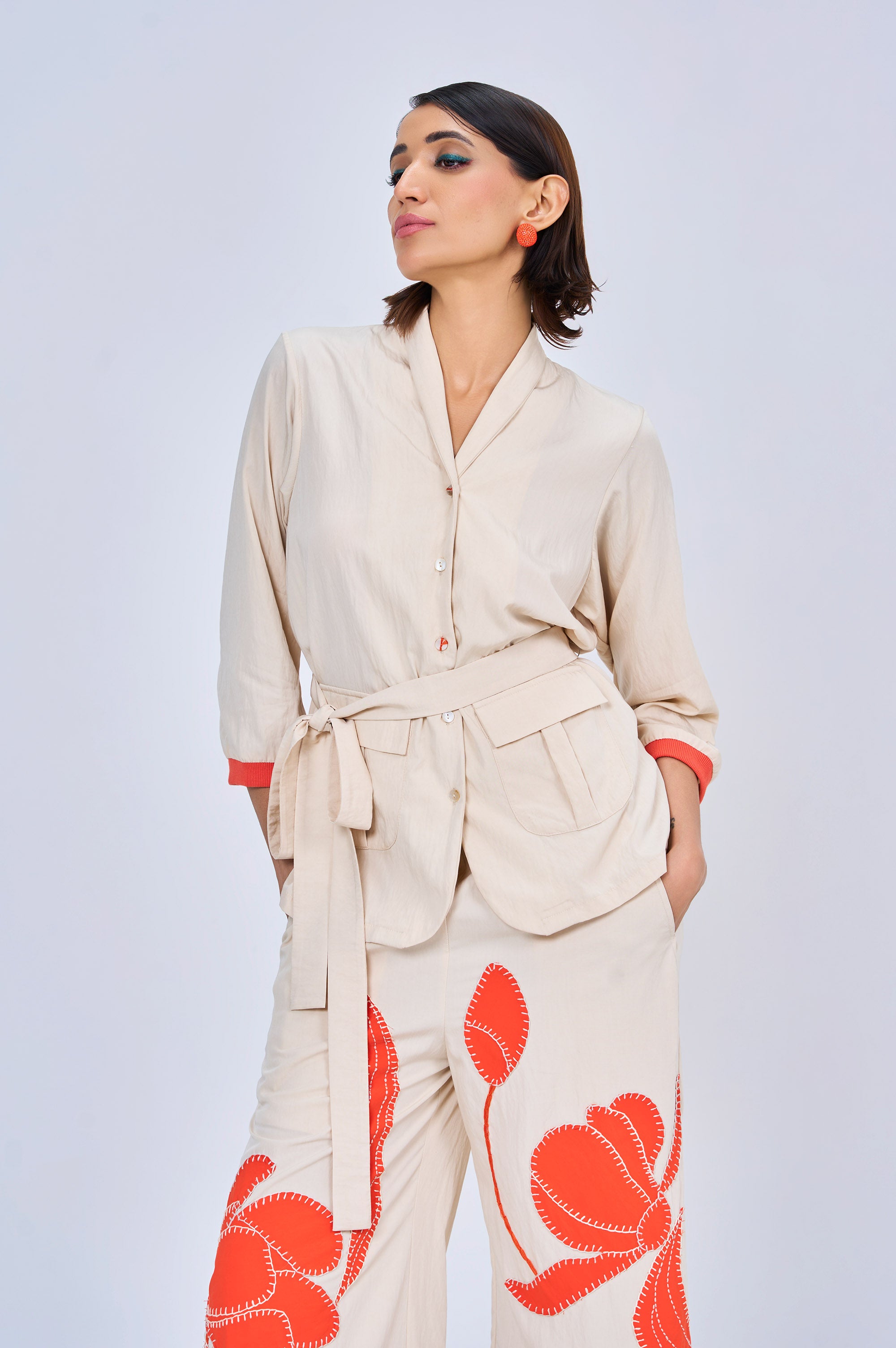 Oops! is a relaxed, thoughtfully tailored co-ord designed with ease and intention. The shirt comes in a warm ivory tone, featuring a soft silhouette with a self-tie belt that gently defines the waist. Subtle orange detailing at the cuffs adds a quiet pop of colour without overpowering the look.