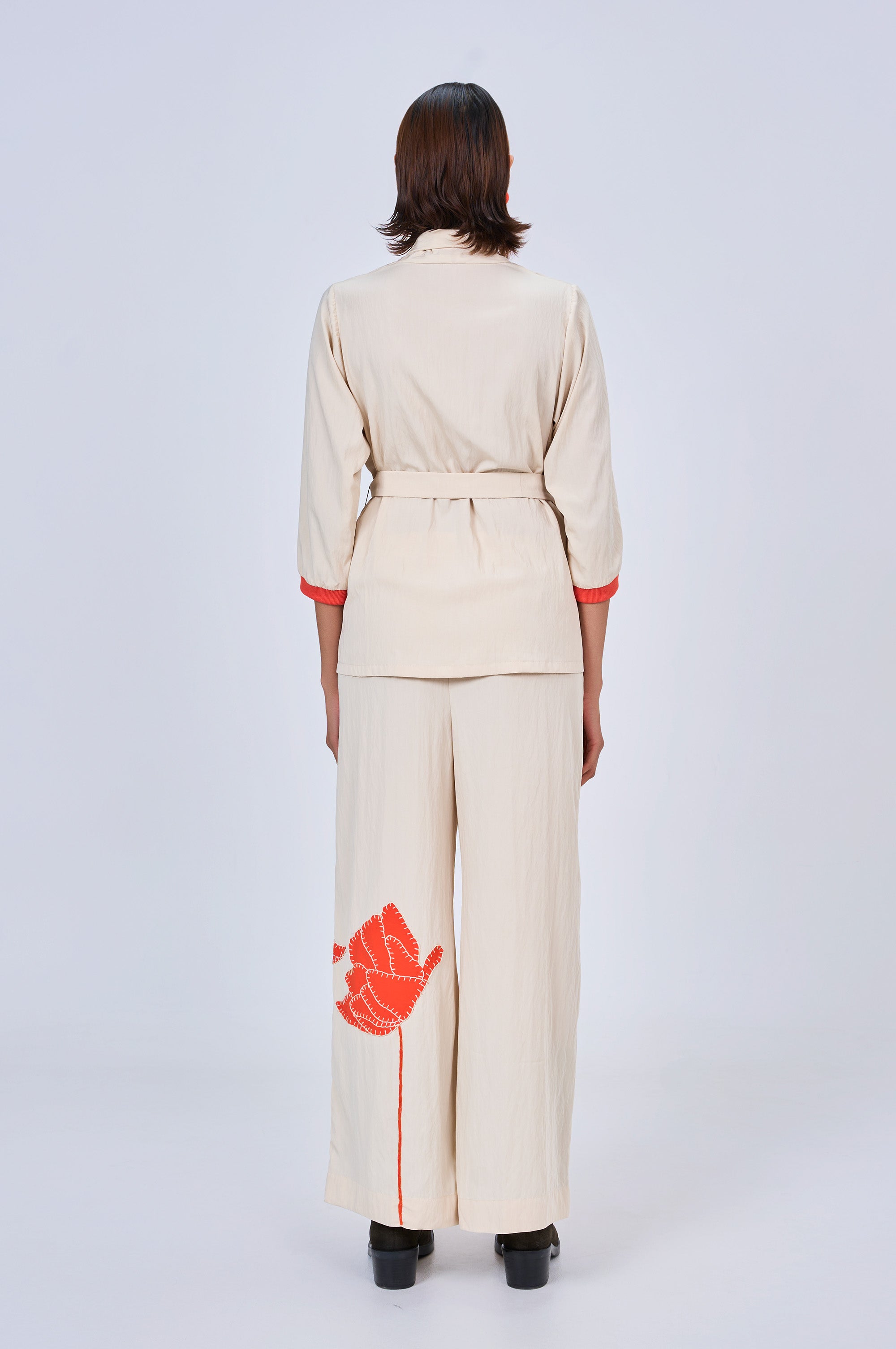 The wide-leg pants are finished with bold orange appliqué embroidery in abstract floral forms, bringing an expressive yet balanced contrast to the ensemble. Designed to be worn together or styled separately, Oops. blends comfort, craft, and confidence effortlessly.